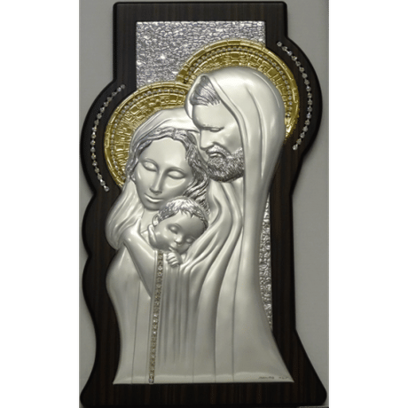 Obraz v prevedení striebro na dreve s motívom Matky Božej s dieťaťom Ježiš v rozmere 37 x 22 cm.
