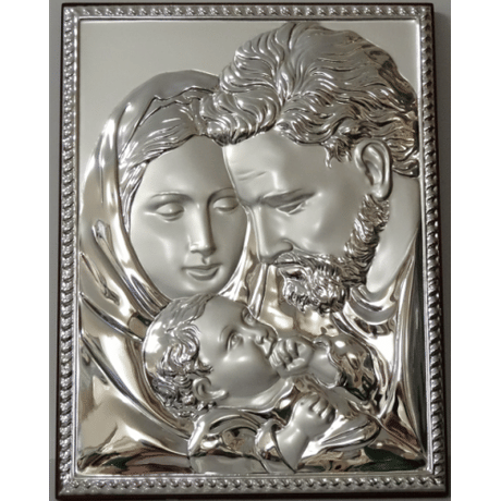 Obraz v prevedení striebro na dreve s motívom Svätej Rodiny v rozmere 25 x 19 cm.