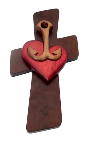 Drevorezba kríža tmavohndej farby vyhotovená v rozmeroch 38 x 19,5 cm. Na kríži je znázornená hnedá kotva a červené srdce.