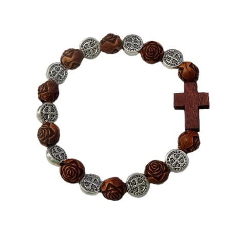 Náramok a zároveň desiatok ruženca s benediktinskými medailami na gumičke.