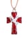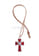 Kovový prívesok striebornej farby v tvare krížika s červenou epoxidovou výplňou a striebornými detailmi v rozmere 4 x 2,5 cm. V strede kríža je zobrazená biela holubica s olivovou ratolesťou v zobáku. Prívesok je zavesený na šnúrke z koženky.