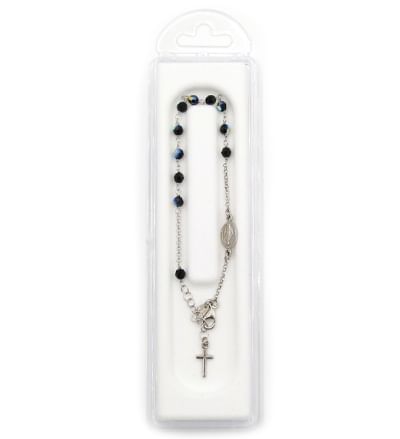 Strieborný rhódiovaný desiatkový náramok s čiernymi Swarovski korálkami s priemerom 4 mm. Náramok obsahuje Zázračnú medailu a prívesok krížik. Výnimočný kresťanský šperk, ktorý ozbobí a poteší každú ženu pri akejkoľvek príležitosti.