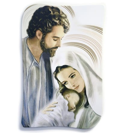 Obraz s motívom Svätej rodiny s rozmermi 58 x 38 cm ladený dobiela. Panna Mária drží v náručí malého Ježiška a nad nimi sa skláňa svätý Jozef.