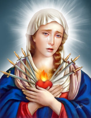 Obraz na dreve s motívom Sedembolestnej Panny Márie. Ide o reprodukciu obrazu nalepeného na drevenom podklade. Obraz má rozmery 41,6 x 29,4 cm.