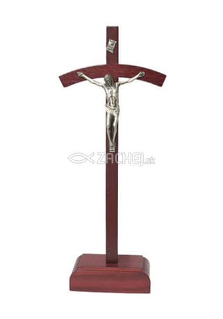 Drevený kríž bordovej farby s podstavcom. Dlhšie - pozdĺžne rameno je rovné. Kratšie - priečne rameno je ohnuté. Korpus a tabuľka s nápisom INRI sú vyrobené z kovu striebornej farby. Kríž má celkový rozmer 25,5 x 10 cm.