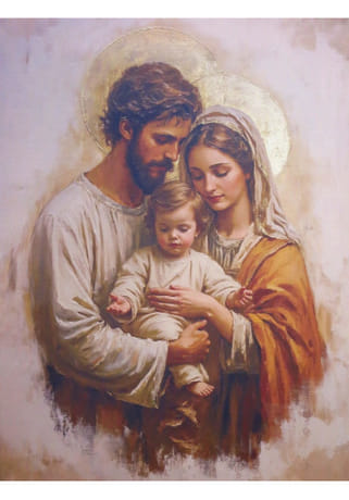 Na obraze vidíme postavy svätého Jozefa a Panny Márie, stojace v tesnej blízkosti a objímajúce malého Ježiška s roztvorenou náručou.