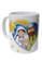 Biely keramický hrnček s farebným obrázkom Svätej rodiny a anjelikov. Hrnček má rozmer 9,5 x 8 cm a je vhodný ako darček pre deti.
