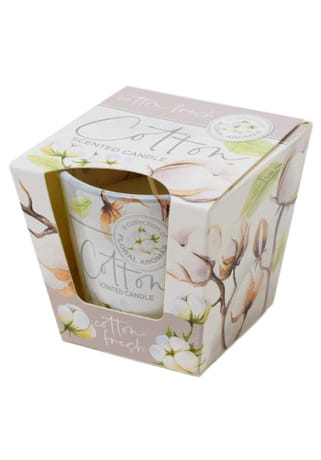 Voňavá sviečka v skle s motívom kvetov, balená v papierovej krabičke.