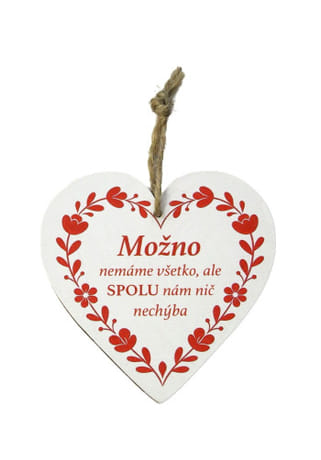 Magnetka v tvare srdca s folkovým ornamentom a nápisom: Možno nemáme všetko, ale SPOLU nám nič nechýba. Magnetka je vyrobená z dreva s rozmermi 9 x 9 cm.