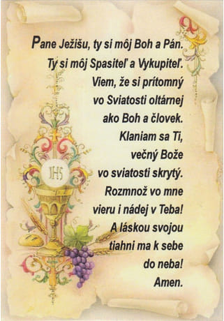 Pane Ježišu, ty si môj Boh a Pán. Ty si môj Spasiteľ a Vykupiteľ. Viem, že si prítomný vo Sviatosti oltárnej ako Boh a človek. Klaniam sa Ti, večný Bože vo sviatosti skrytý. Rozmnož vo mne vieru i nádej v Teba. A láskou svojou tiahni ma k sebe do neba! Amen.