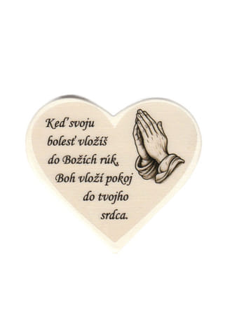 Drevená magnetka v tvare srdca svetlej farby, vyrobená v rozmere 6 x 7 cm. Vľavo je nápis: Keď svoju bolesť vložíš do Božích rúk, Boh vloží pokoj do tvojho srdca. Vpravo je obrázok zopnutých rúk.