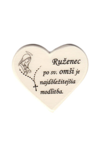 Drevená magnetka v tvare srdca svetlej farby, vyrobená v rozmere 6 x 7 cm. Vľavo je znázornený malý obrázok Panny Márie a ruženca. Vpravo je nápis: Ruženec po sv. omši je najdôležitejšia modlitba.