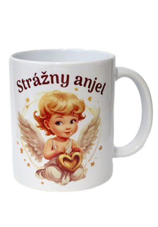 Biely keramický hrnček vyrobený v rozmere 9,5 x 8 cm, na ktorom je znázornený sediaci anjelik so srdiečkom zlatej farby. Nad ním je nápis Strážny anjel. Hrnček je vhodný ako darček pre deti.