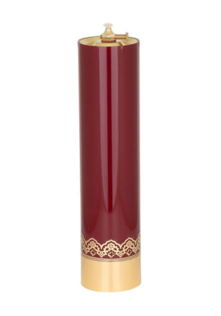Olejová svieca bordovej farby vysoká 31 cm, s priemerom 7,5 cm a s objemom vkladu 180 ml.