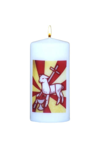 Biela 245-gramová dekoratívna sviečka s motívom veľkonočného baránka, vyrobená zo zdravotne nezávadného parafínu vysokej kvality.