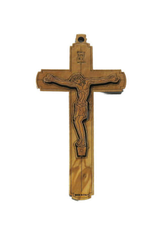 Kríž s rozmerom 12,5 x 6,7 cm, celý vyhotovený z olivového dreva. Plochý korpus mierne vystupuje do priestoru nad úroveň kríža. Na konci ramien sú malé výrezy. Nad korpusom je naznačený zvitok s písmenami INRI.