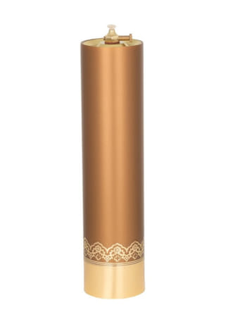 Olejová svieca zlatej farby vysoká 31 cm, s priemerom 7,5 cm a s objemom vkladu 180 ml.