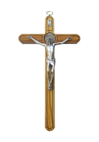 Benediktínsky kríž z olivového dreva s rozmerom 34 x 19 cm, určený na zavesenie. Korpus, tabuľka INRI a medaila svätého Benedikta sú z kovu striebornej farby.