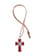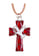 Kovový prívesok striebornej farby v tvare krížika s červenou epoxidovou výplňou a striebornými detailmi v rozmere 7 x 4,5 cm. V strede kríža je zobrazená biela holubica s olivovou ratolesťou v zobáku. Prívesok je zavesený na šnúrke z koženky.