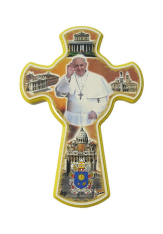 Žltý drevený kríž s farebným obrázkom Svätého Otca Františka a štyroch pápežských bazilík.