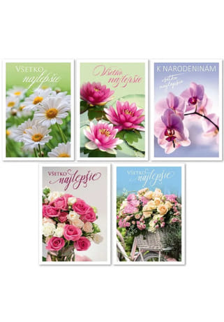 Mix pohľadníc s farebným motívom rôznych druhov kvetov, určených ku gratulácii (narodeniny, meniny).