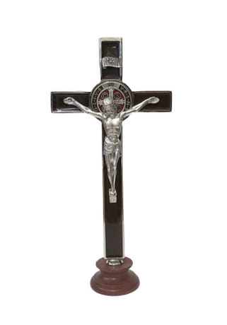 Stolový kríž v strieborno-hnedom prevedení s farebnou medailou svätého Benedikta a detailne spracovaným korpusom striebornej farby, vyrobený v rozmere 21 x 9,8 cm. Stabilný drevený podstavec umožňuje bezpečné umiestnenie na stôl, poličku alebo oltárik.