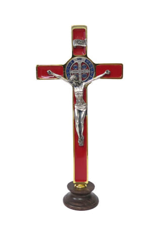 Stolový kríž v zlato-červenom prevedení s farebnou medailou svätého Benedikta a detailne spracovaným korpusom striebornej farby, vyrobený v rozmere 21 x 9,8 cm. Stabilný drevený podstavec umožňuje bezpečné umiestnenie na stôl, poličku alebo oltárik.