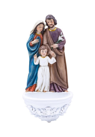 Svätenička vyrobená z polyresínu v rozmere 19,5 x 9 cm zobrazuje Svätú rodinu - Pannu Máriu, svätého Jozefa a malého Ježiša. Mária má červený odev s modrým plášťom, Jozef fialovo-hnedý habit a v ruke drží ľaliu, symbol čistoty. Ježiš je zobrazený v bielom odeve s vystretými rukami. Spodná biela časť sväteničky slúži ako nádobka na svätenú vodu a je ozdobená barokovými ornamentmi.