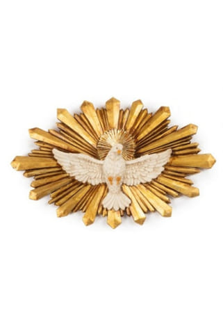 Elegantná náboženská dekorácia z polyresínu s výraznou symbolikou. Dominantným prvkom je biela holubica s rozprestretými krídlami, ktorá predstavuje Ducha Svätého. Za ňou sa rozprestiera zlatá aureola vytvorená z lúčov rôznej dĺžky. Reliéfne spracovanie lúčov s jemným barokovým nádychom vytvára pôsobivý efekt žiarenia.