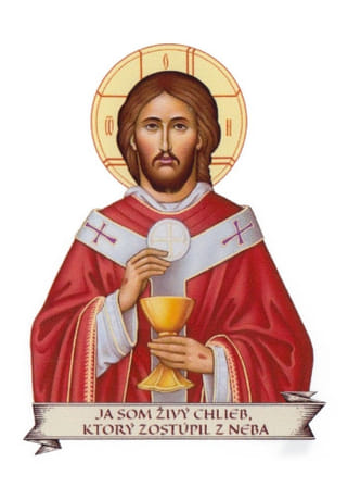Samolepka znázorňuje Krista Veľkňaza s kalichom a hostiou. Naspodku je nápis Ja som živý chlieb, ktorý zostúpil z neba.