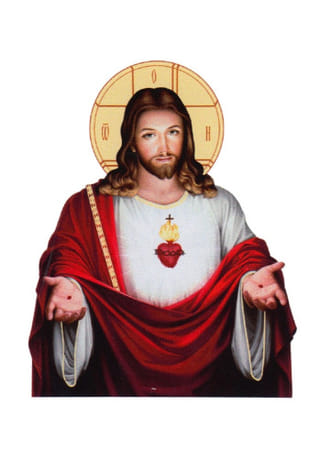 Papierová samolepka s motívom Božského Srdca Ježišovho. Pán Ježiš v červeno-bielom rúchu vystiera prebodnuté dlane.