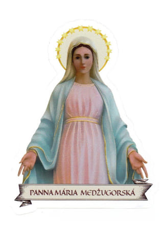 Papierová samolepka s motívom Panny Márie Medžugorskej.