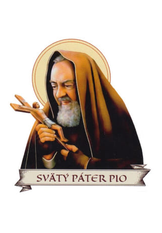 Samolepka s podobizňou obľúbeného svätca Pátra Pia. Kapucín je znázornený v rehoľnom rúchu so zlatou svätožiarou a v rukách drží kríž s ukrižovaným Kristom.
