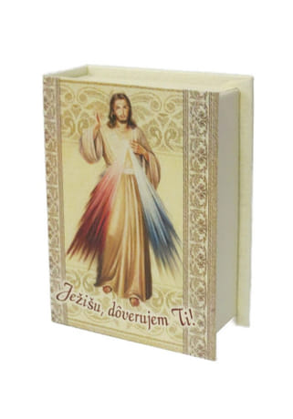 Papierová krabička na ruženec s farebným obrázkom milosrdného Ježiša a s nápisom Ježišu, dôverujem Ti!