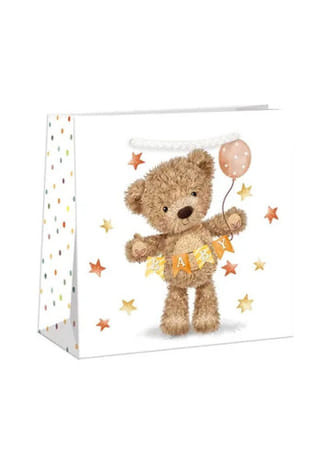 Biela darčeková taška s farebným obrázkom medvedíka s balónom. Medvedík drží girlandu s nápisom BABY. Ľavý a pravý bok tašky sú ozdobené farebnými bodkami. Taška má rozmer 16 x 16 cm. Vhodná na darček k narodeniu dieťaťa, ku krstinám či na narodeniny dieťaťa.