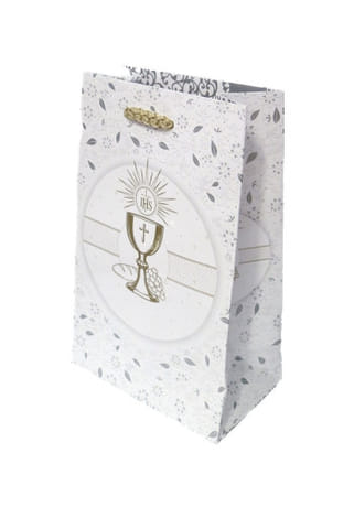 Podčiarknite výnimočnosť sviatočného okamihu elegantnou darčekovou taškou s motívom Sviatosti oltárnej. Jemný biely podklad v kombinácii so zlatými a sivými detailmi vytvára nadčasový, luxusný vzhľad, ktorý zaujme na prvý pohľad.