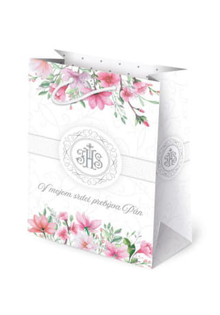 Elegantná biela darčeková taška zdobená potlačou ružových kvetov a dekoratívnym motívom IHS, ktorý je obklopený vkusným ornamentom. Nápis „V mojom srdci prebýva Pán“ dodáva taške duchovný rozmer. Potlač plynule pokračuje aj na bočných stranách, čím vytvára harmonický a ucelený vzhľad.