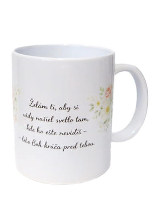 Biely keramický hrnček s citátom „Želám ti, aby si vždy našiel svetlo tam, kde ho ešte nevidíš – lebo Boh kráča pred tebou.“ je krásnym a povzbudzujúcim darčekom s duchovným posolstvom. Nežný dizajn dopĺňajú farebné kvietky, ktoré pôsobia elegantne a dodávajú hrnčeku svieži, radostný vzhľad.