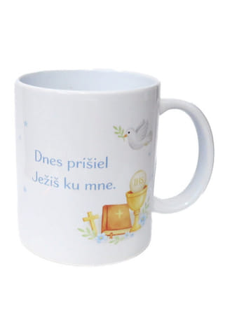 Biely keramický hrnček s jemným modrým nápisom „Dnes prišiel Ježiš ku mne“ je krásnym a symbolickým darčekom k 1. svätému prijímaniu pre chlapca. Jeho nežný dizajn dopĺňajú kresťanské motívy – holubica s ratolesťou ako znak pokoja a Ducha Svätého, decentný kalich s hostiou, kniha symbolizujúca Božie slovo a malý krížik ako vyjadrenie viery.