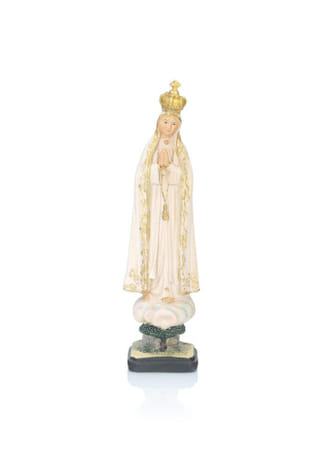 Soška zobrazuje Pannu Máriu v typickej fatimskej podobe – s rukami zopätými k modlitbe a s korunou na hlave. Precízne detaily a jemné farebné prevedenie (biele so zlatými detailmi) dodávajú postave realistický a zároveň nežný vzhľad. Podstavec je stabilný a esteticky dopĺňa celkový dizajn.