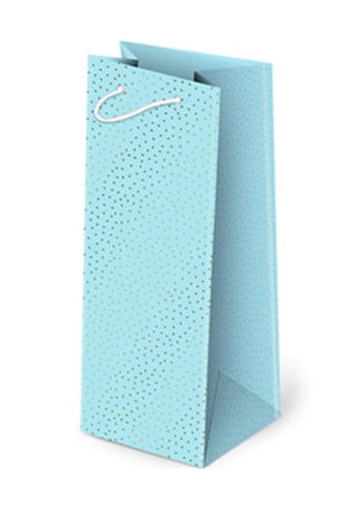 Elegantná darčeková taška určená na balenie jednej fľaše vína, sektu alebo iného prémiového nápoja. Vďaka štýlovému svetlomodrému prevedeniu s jemným reliéfnym vzorom a metalickou fóliou pôsobí luxusne a je ideálnou voľbou na darčekové príležitosti.