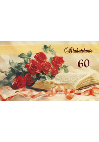 Elegantný gratulačný pozdrav k 60. narodeninám s jemným motívom červených ruží a otvorenej knihy. Vkusný dizajn dopĺňa zlatisté pozadie a slávnostná stuha, ktoré spolu vytvárajú dôstojnú a srdečnú spomienku na významné jubileum.