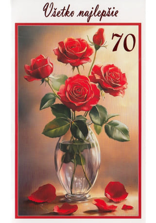 Pozdrav k jubileu - 70-tym narodeninám s obrázkom červených ruží vo váze a s nápisom Všetko najlepšie.