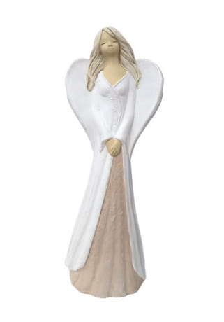 Dekoratívna socha anjela v podobe ženy z kvalitnej sadry zaujme jemným výrazom a vkusným spracovaním detailov. Ženská postava s dlhými splývavými vlasmi, veľkými krídlami a pokojne zloženými rukami pôsobí harmonicky a vznešene. Kombinácia bielej a jemnej prírodnej farby zvýrazňuje ladné línie a dodáva soche nadčasový, elegantný vzhľad.