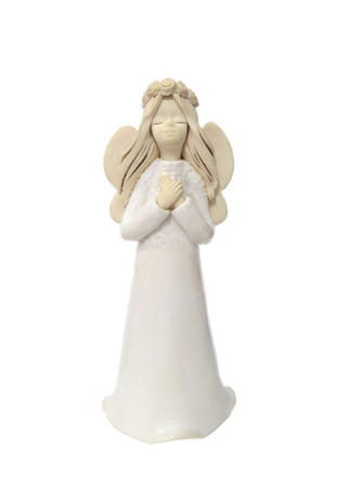 Nežný keramický anjel v podobe dievčaťa s jemným venčekom vo vlasoch pôsobí pokojne a harmonicky. Ruky zopnuté v modlitbe symbolizujú vieru, pokoru a vnútorný pokoj, vďaka čomu sa táto dekorácia stáva krásnym duchovným doplnkom do každého interiéru.