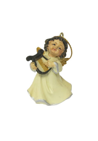 Figúrka je vyrobená z polyresínu (odolnej živice) a má rozmery 5 × 3,5 cm. Vyznačuje sa jemnými pastelovými odtieňmi doplnenými o zlaté a strieborné detaily. Precízne spracovanie tváre, krídel aj hudobného nástroja dodáva ozdobe autentický a vkusný vzhľad. Vďaka praktickému očku so šnúrkou je anjelik ideálny na zavesenie na vianočný stromček, vetvičky...