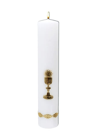 Elegantná biela svieca s jemným zlatým zdobením, ktorá je ideálna pre liturgické príležitosti aj slávnostné chvíle. Dominantným prvkom je detailne spracovaný motív kalicha s hostiou.